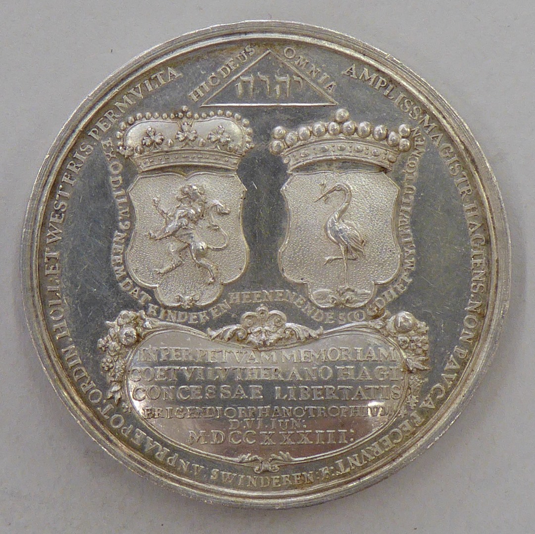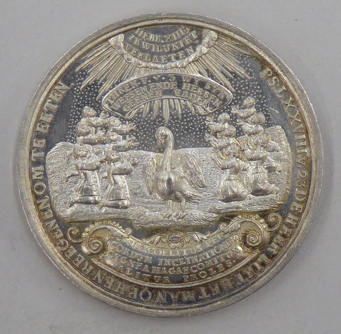 Penning stichting Wees- en Oudeliedenhuis te Den Haag 1736 met zwaan tussen wezen, kz. twee wapens