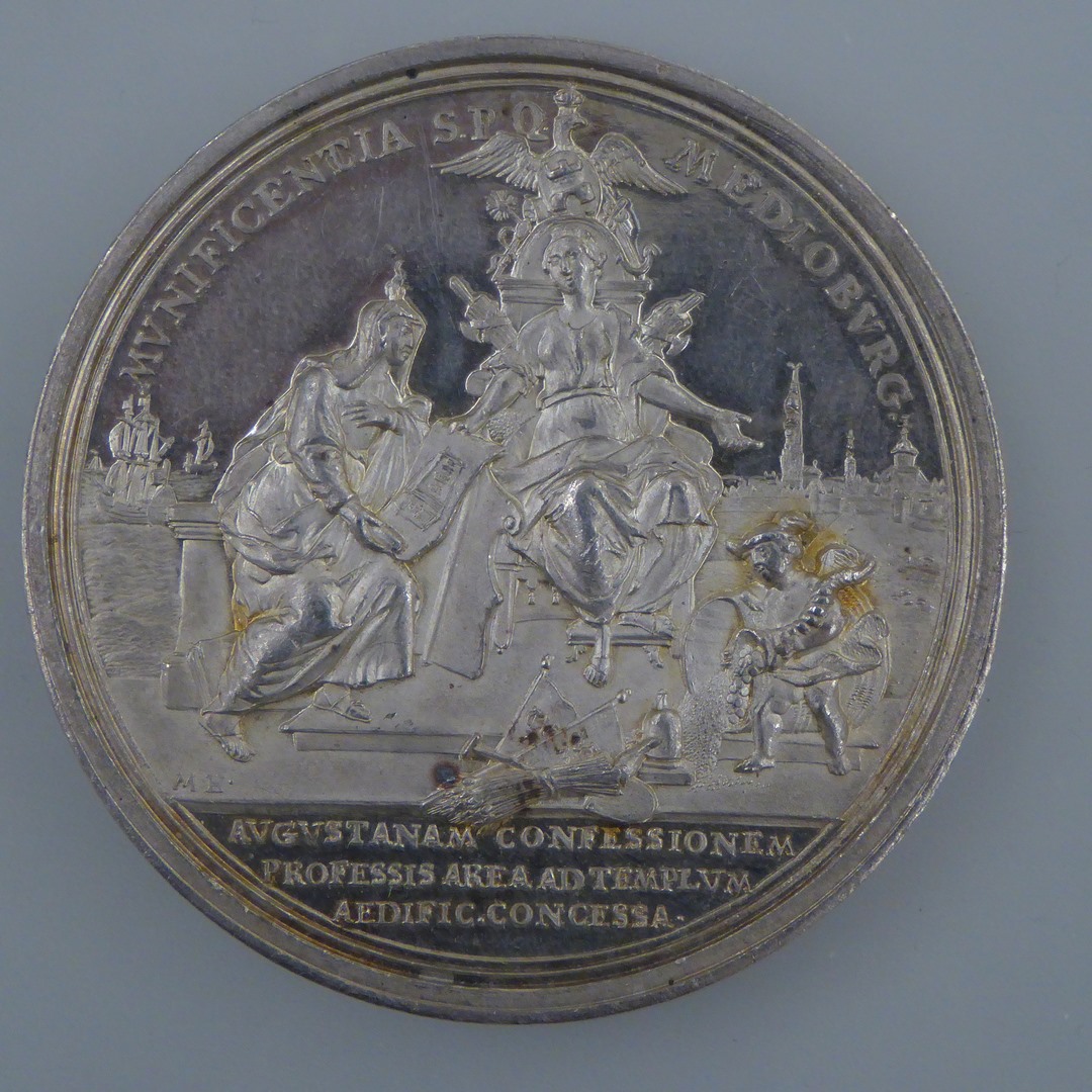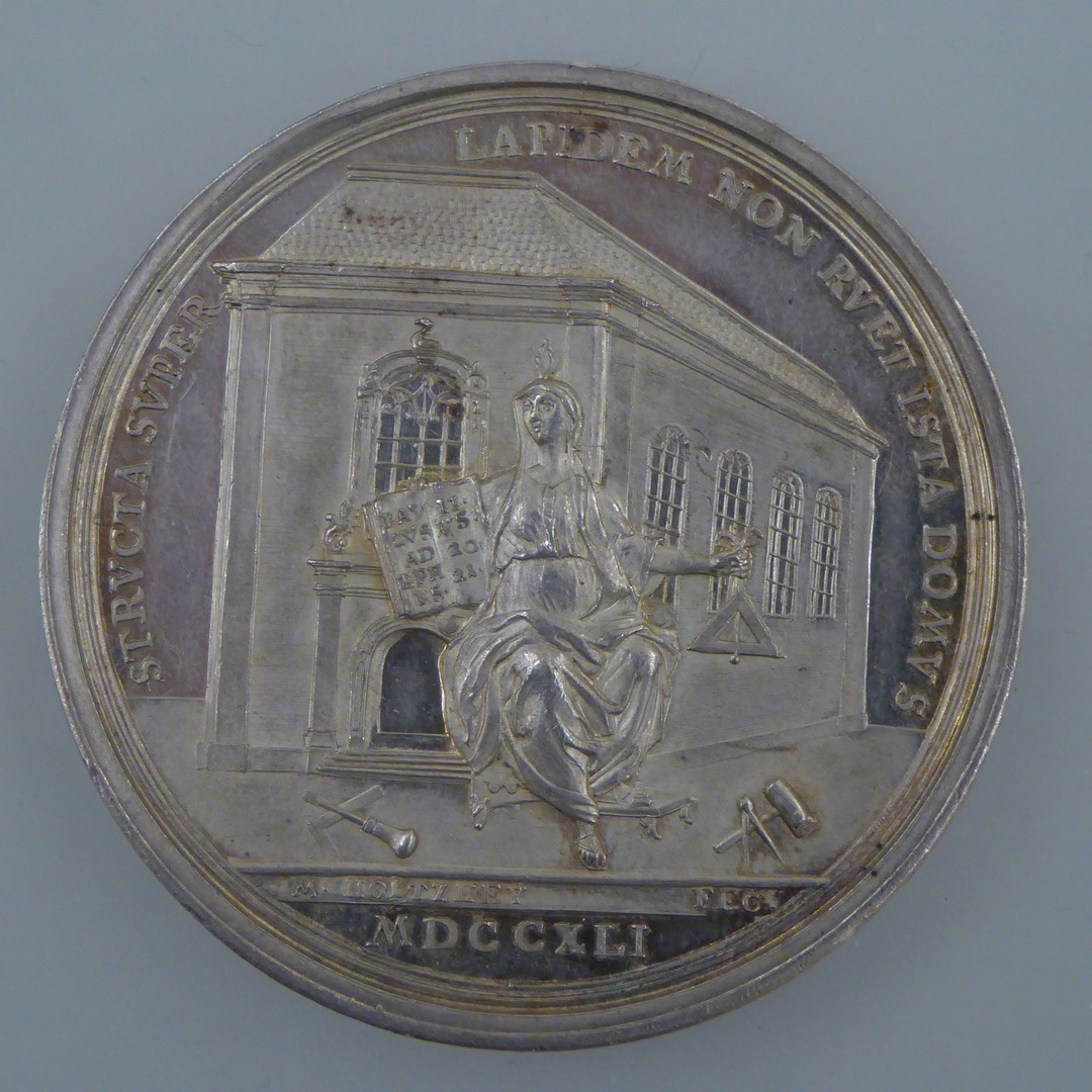 Penning met Lutherse kerk Middelburg, opschrift, kz. bouwplan getoond aan stadsmaagd, opschrift