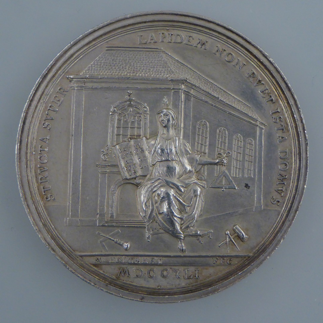 Penning met Lutherse kerk Middelburg, opschrift, kz. bouwplan getoond aan stadsmaagd, opschrift, met randschrift: "INGEWYD 20 MAY 1742 DOOR ZACHARIAS FELDMAN HAGGAI 2 vs 10 EN CHRI stoffEL MICHELS UYT NEHEM IA 8 vs 6"