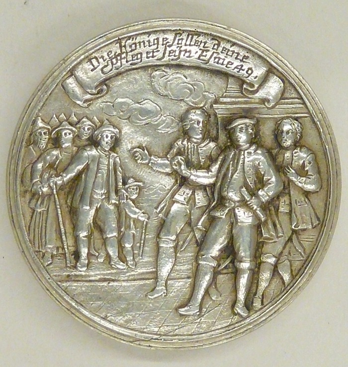 Penning op Salzburgse uitwijkelingen, God wijst op drie mensen, met "Gehe aus deinem Vatterland und von deiner Freundschafft Gen. 12", kz. met "Die Könige sollen deine Pfleger seyn Esaie 49"