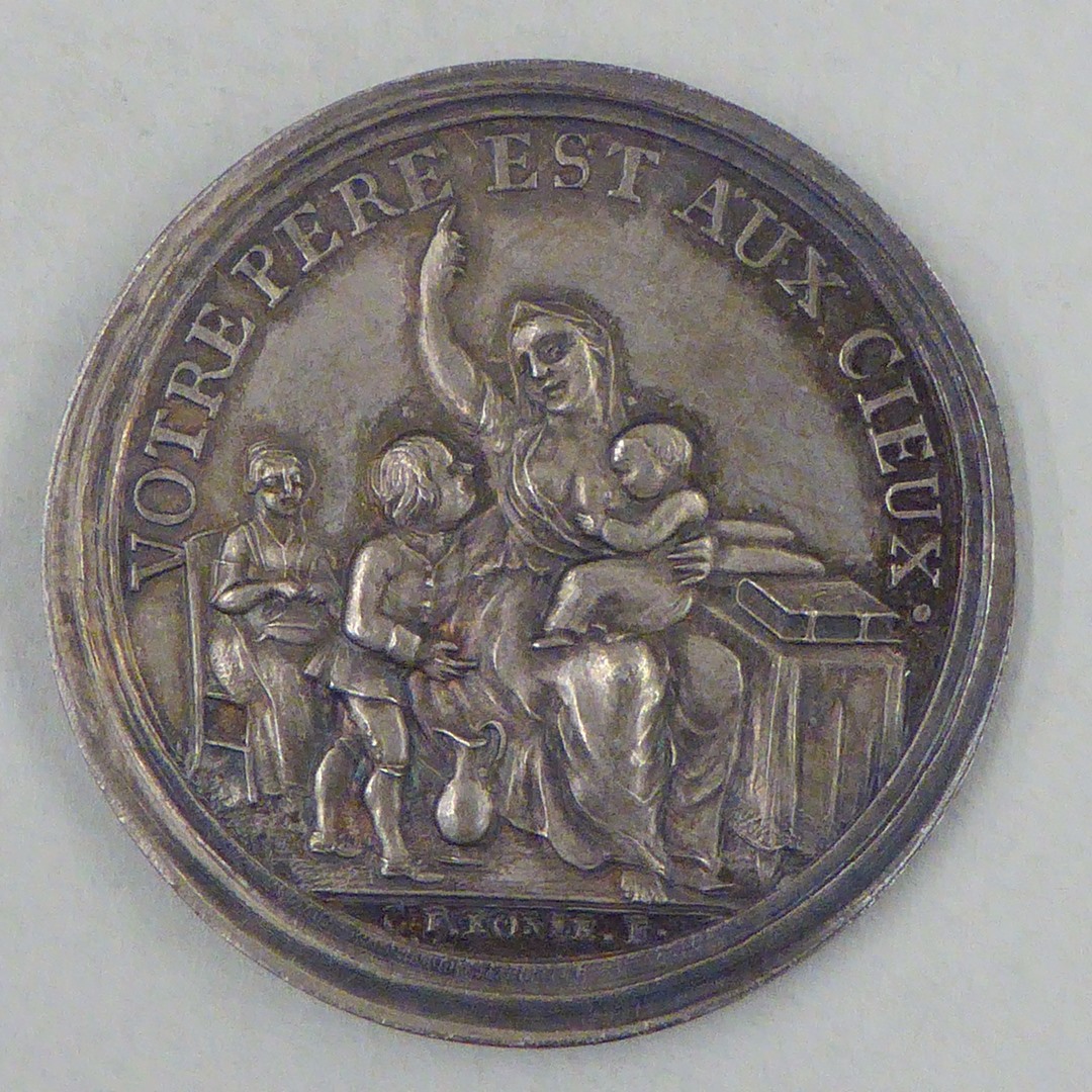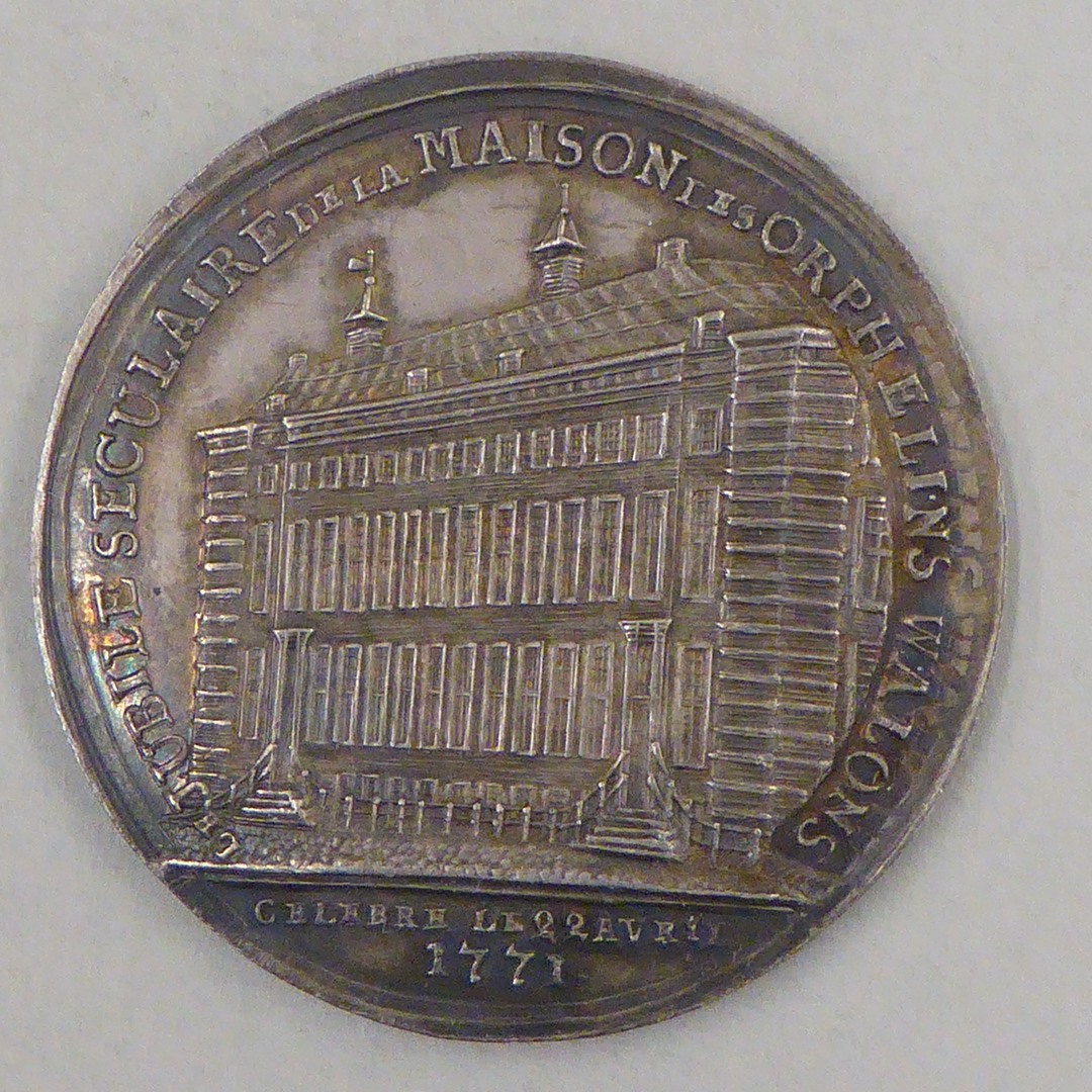 Penning 100-jaar Weeshuis Waalse Gemeente met weeshuis, tekst (Frans), kz. 2 vrouwen en 2 wezen