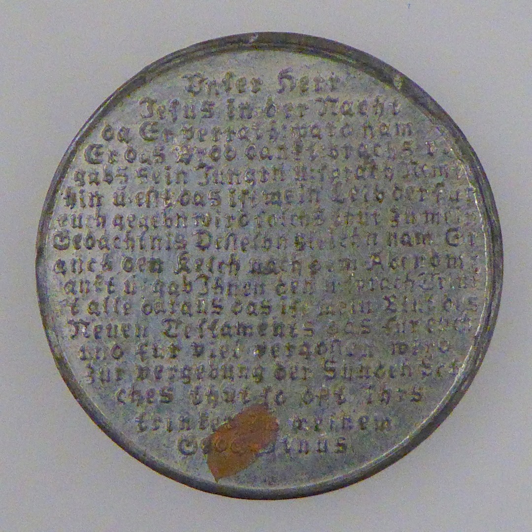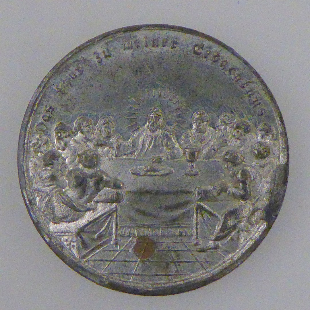 Penning (een van zeven) met laatste avondmaal, kz. de inzettingswoorden van het H. Avondmaal