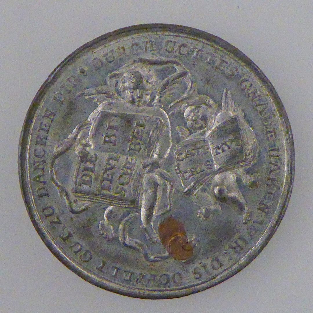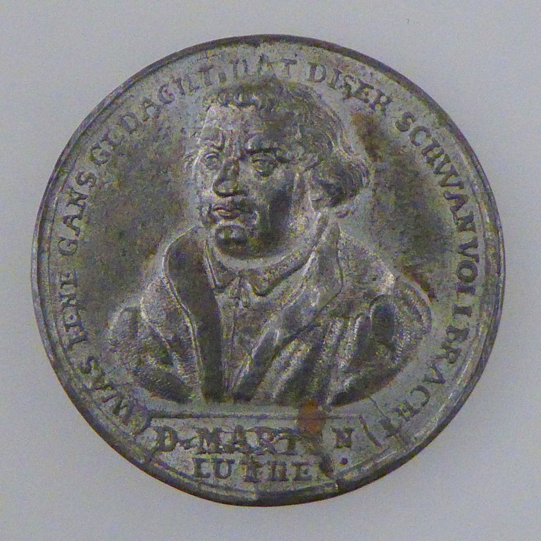 Penning (een van zeven) met M. Luther, kz. bijbel en catechismus