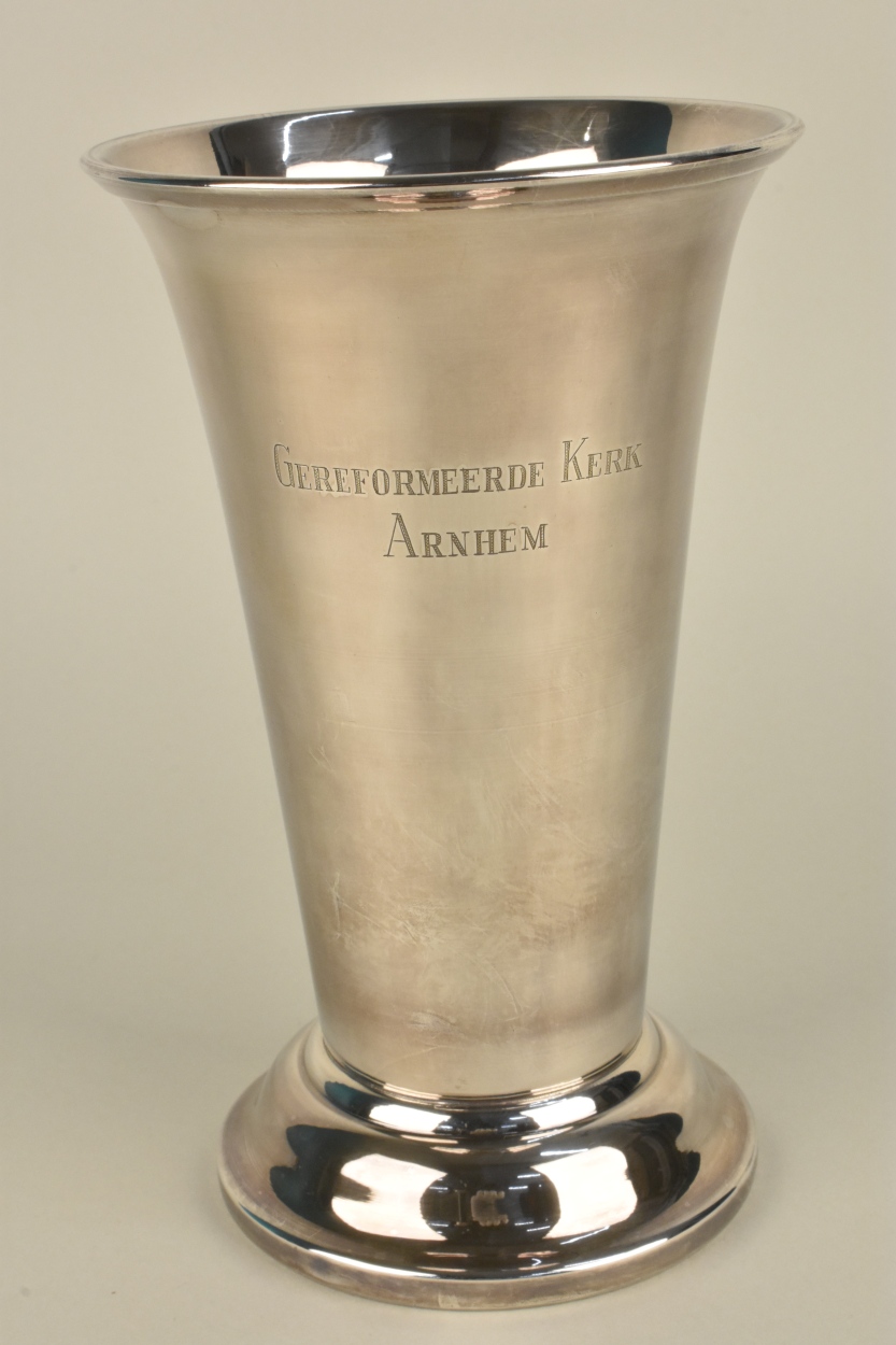 Avondmaalsbeker met "Gereformeerde Kerk Arnhem" glad conisch model, met licht uitlopende drinkrand