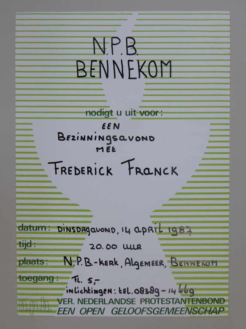 Affiche voor bezinningsavond met F. Franck in N.P.B. kerk Bennekom