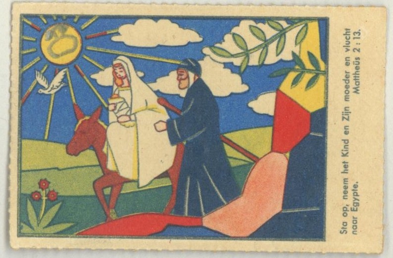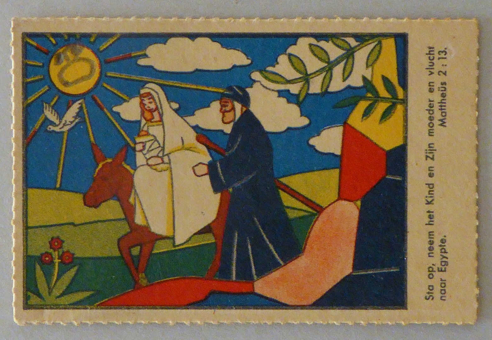 Beloningsplaatje met Maria en Jozef en met "Sta op, neem het Kind en Zijn moeder en vlucht naar Egypte. Mattheüs 2:13"