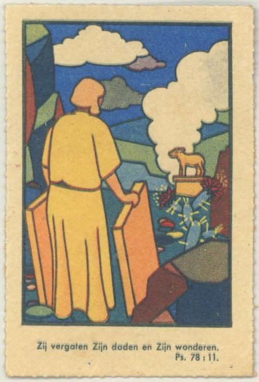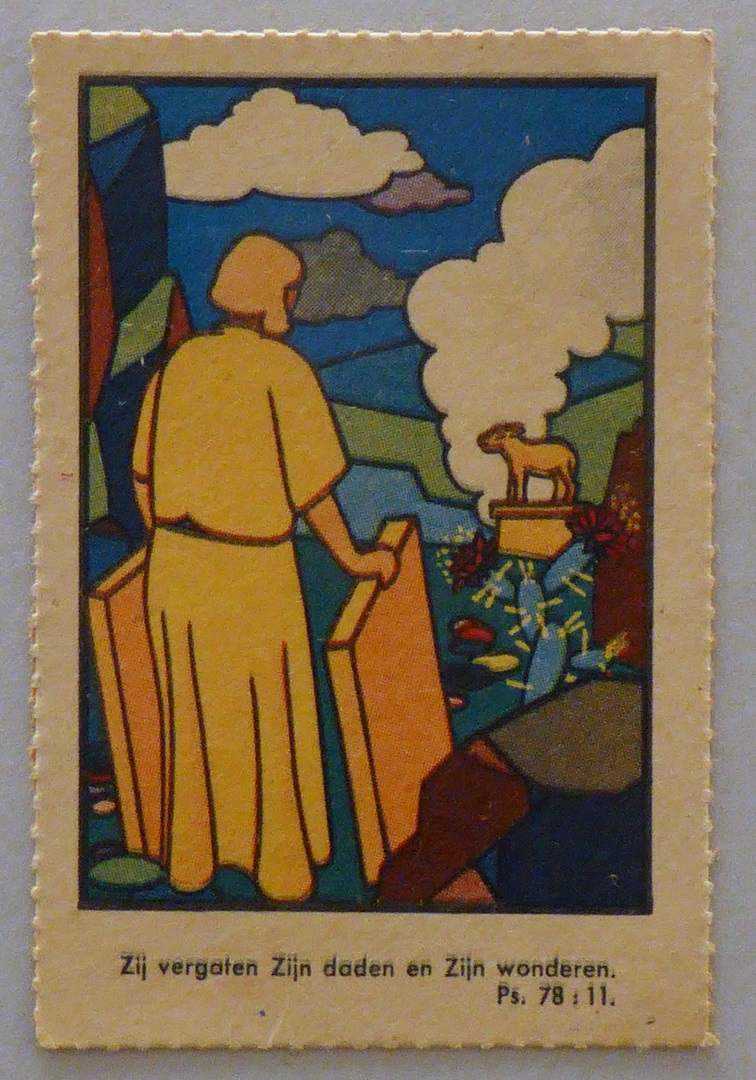 Beloningsplaatje met Mozes met stenen tafelen en gouden kalf en met "Zij vergaten Zijn daden en Zijn wonderen. Ps. 78:11."