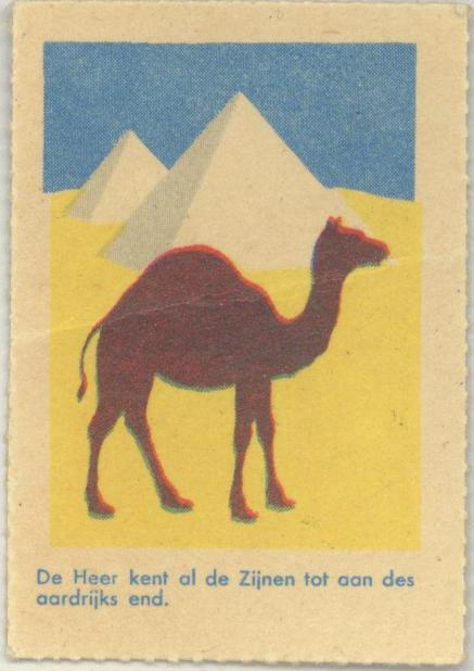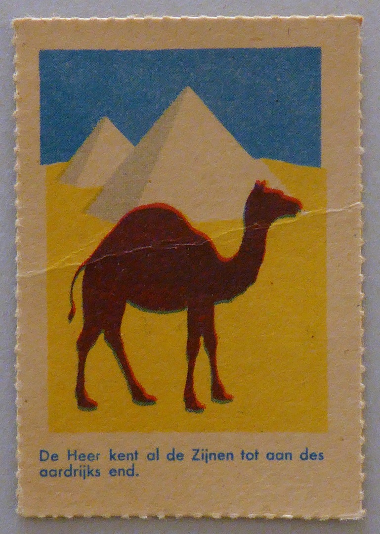 Beloningsplaatje met dromedaris en met "De Heer kent al de Zijnen tot aan des aardrijks end."