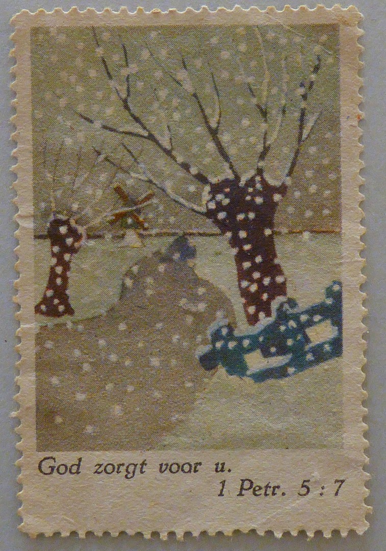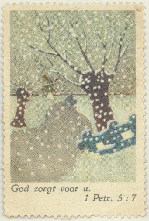 Beloningsplaatje met landweg in de sneeuw en met "God zorgt voor u. 1 Petr. 5:7"
