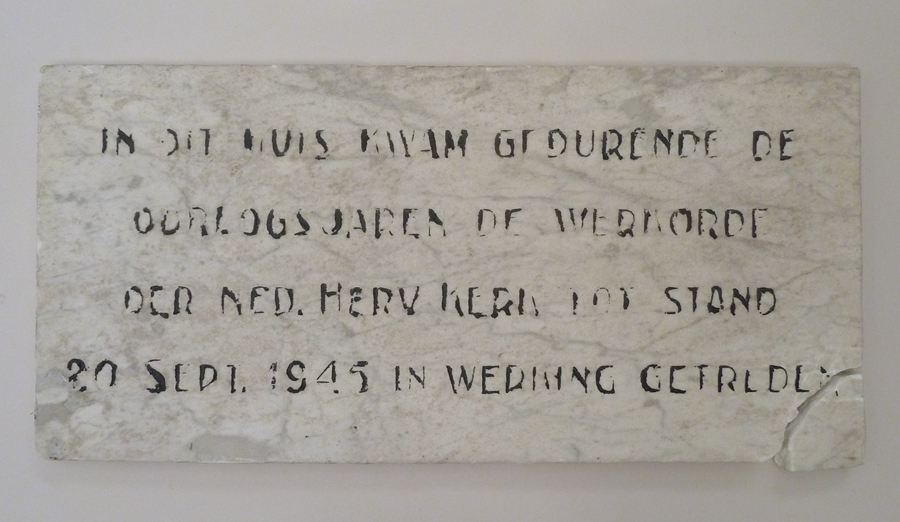 Gevelsteen hotel 'De Valk' te Nunspeet, met "... de werkorde der Ned. Herv. kerk .. 20 sept 1945 .."