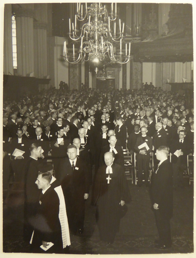 Afgevaardigden naar de Assemblee 1948 komen in optocht de Nieuwe Kerk te Amsterdam binnen