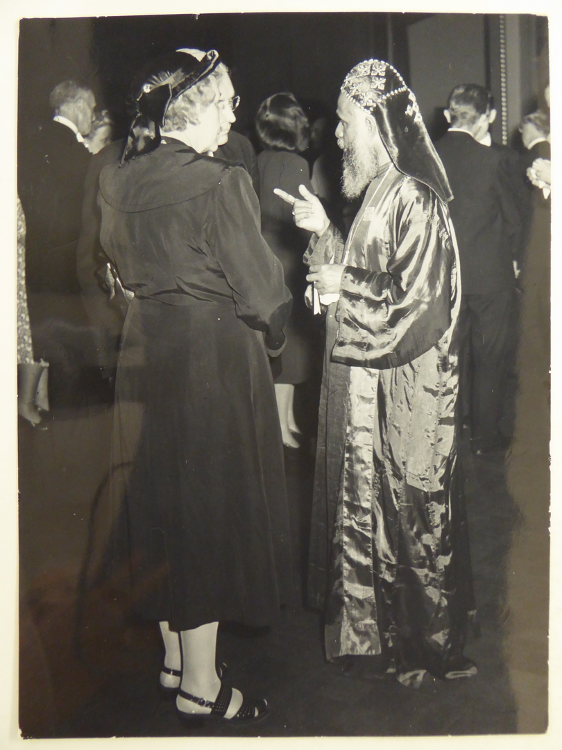 Drie personen onder wie patriarch Syrische kerk in gesprek op Assembleevergadering te Amsterdam