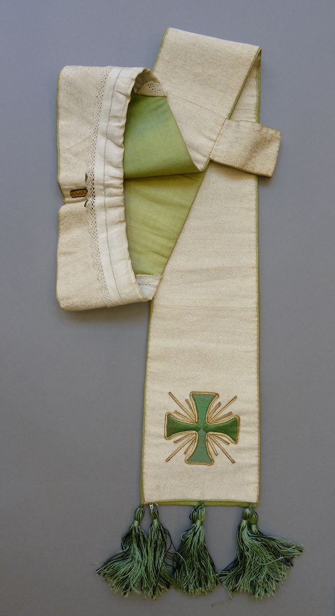 Witte stola met ingeweven bloemmotiefje, groene kruisen met gouden stralen, groene kwasten