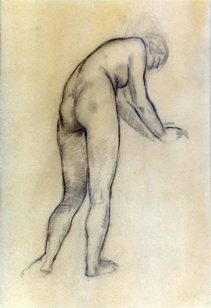 Vrouwelijk naakt, naar voren buigend en op de rug gezien.