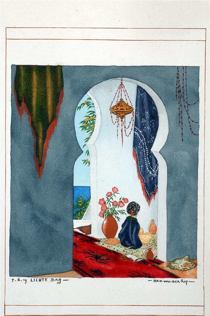Oosters doorkijkje op zee via twee hoefijzervormige openingen, met een zittende figuur op de rug gezien.