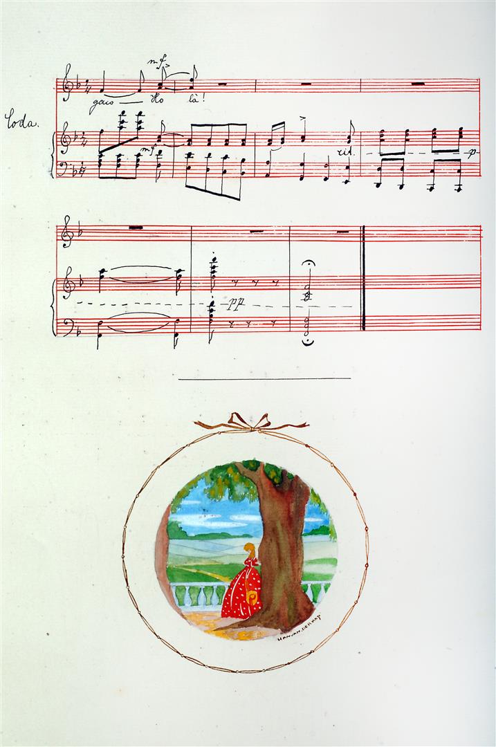 Illustratie bij Chansonnette. Musique de Georges Auvrey. Muzieknotatie en illustratie in ronde vorm met cirkel eromheen, peinzend meisje bij boom.