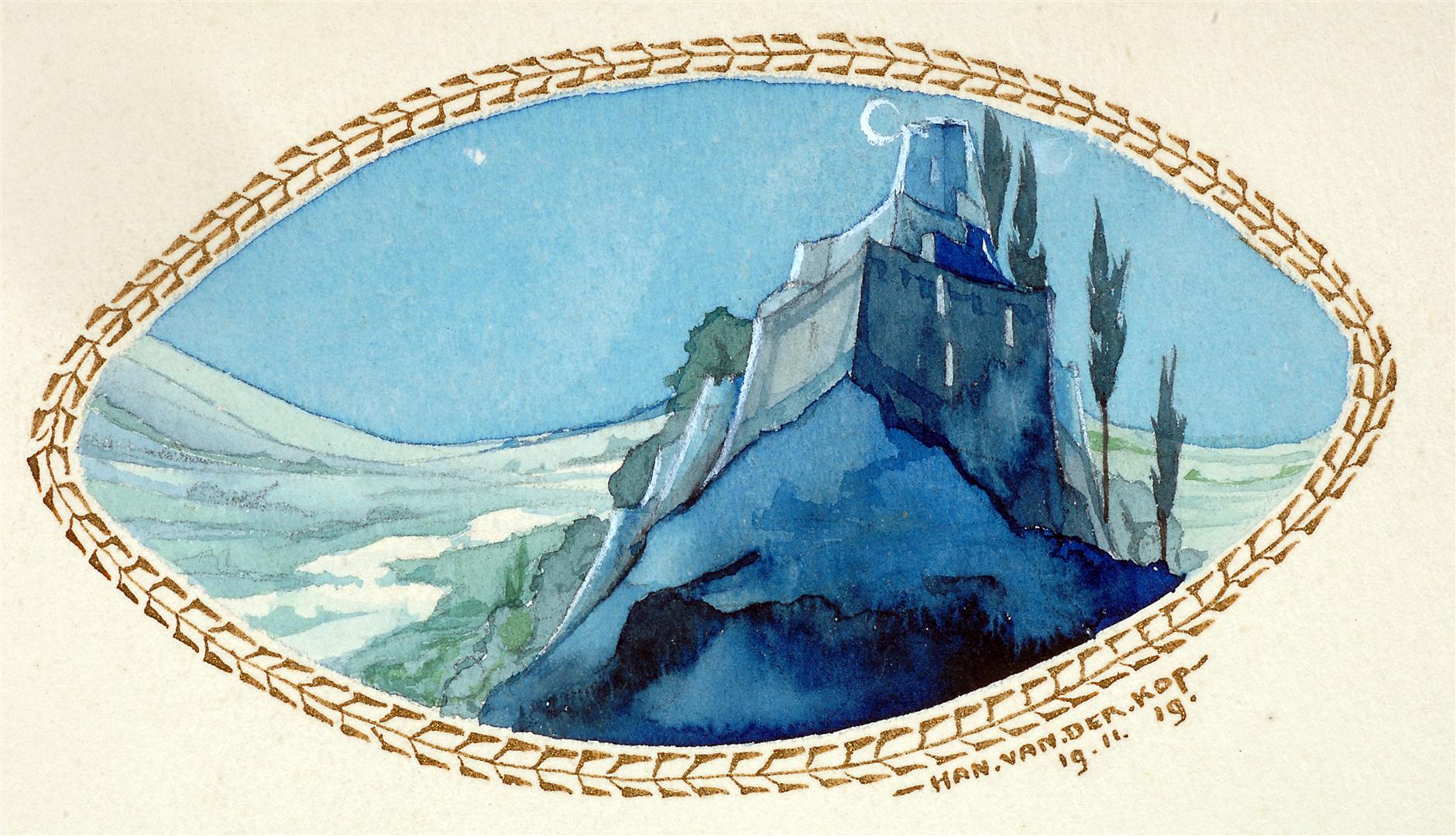 Een maanlandschap, op de voorgrond een kasteel-achtig bouwsel op een rots in een ovaal.