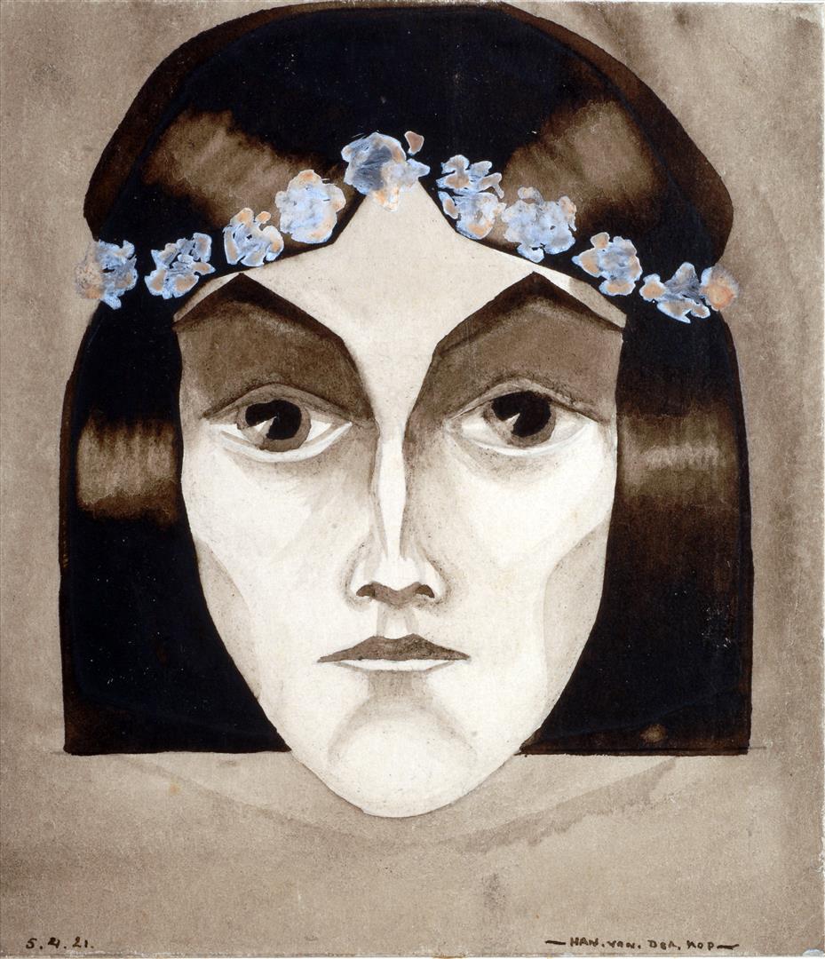 Portret jonge vrouw en face, hoekig in de stijl van Jan Toorop.