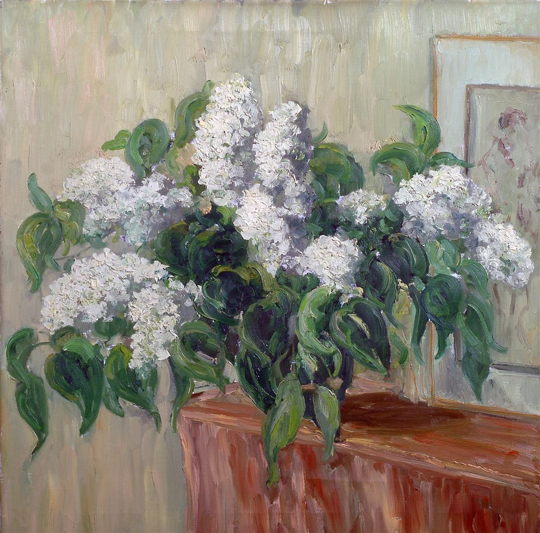 Een bloemstilleven met witte seringen op een kast of schoorsteenmantel. Op de achtergrond een ingelijste portrettekening.