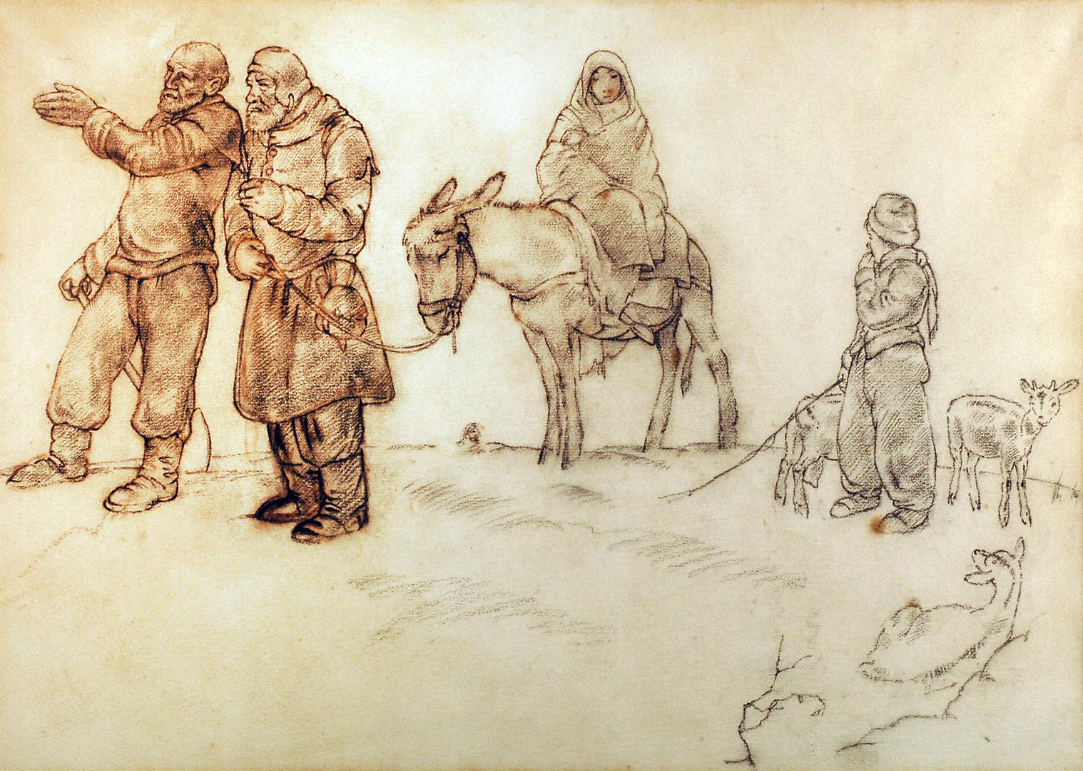Een scene uit de Bijbel, Mattheus 2, de vlucht van Jozef en Maria en het kind Jezus naar Egypte.