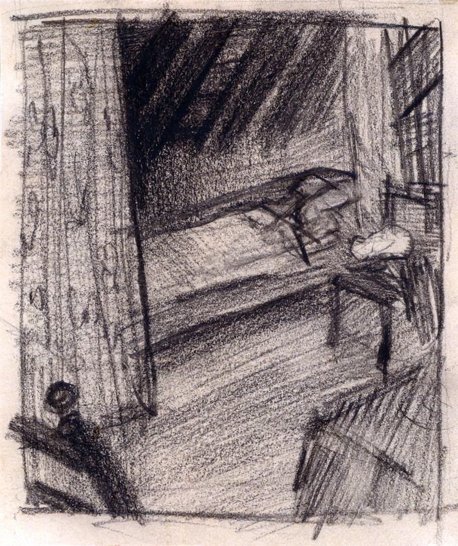 Houtskooltekening van een zolderkamer met een bed waarvoor open gordijnen zijn opgehangen. Er staan twee stoelen en een tafel in de kamer.