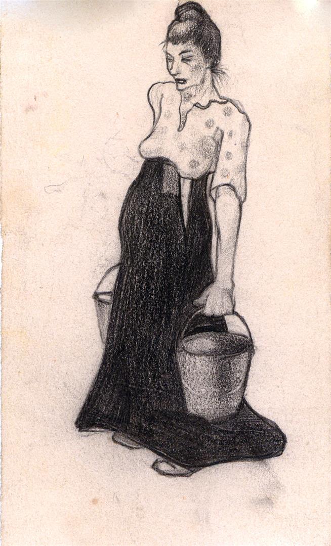 Krijttekening van een vrouw met twee emmers in haar handen.