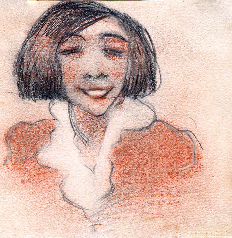 Een vrolijk kijkende vrouw in rood en zwart krijt getekend, in potlood opgezet.