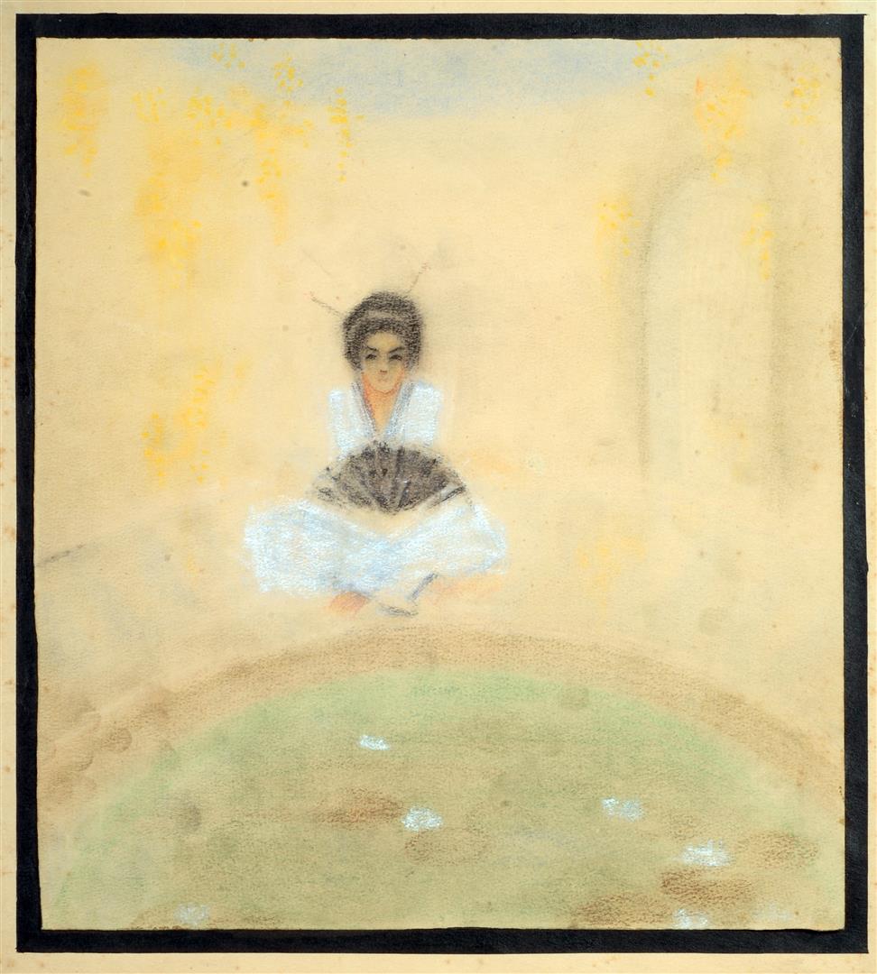 Zittende geisha met waaier voor een groene vijver.