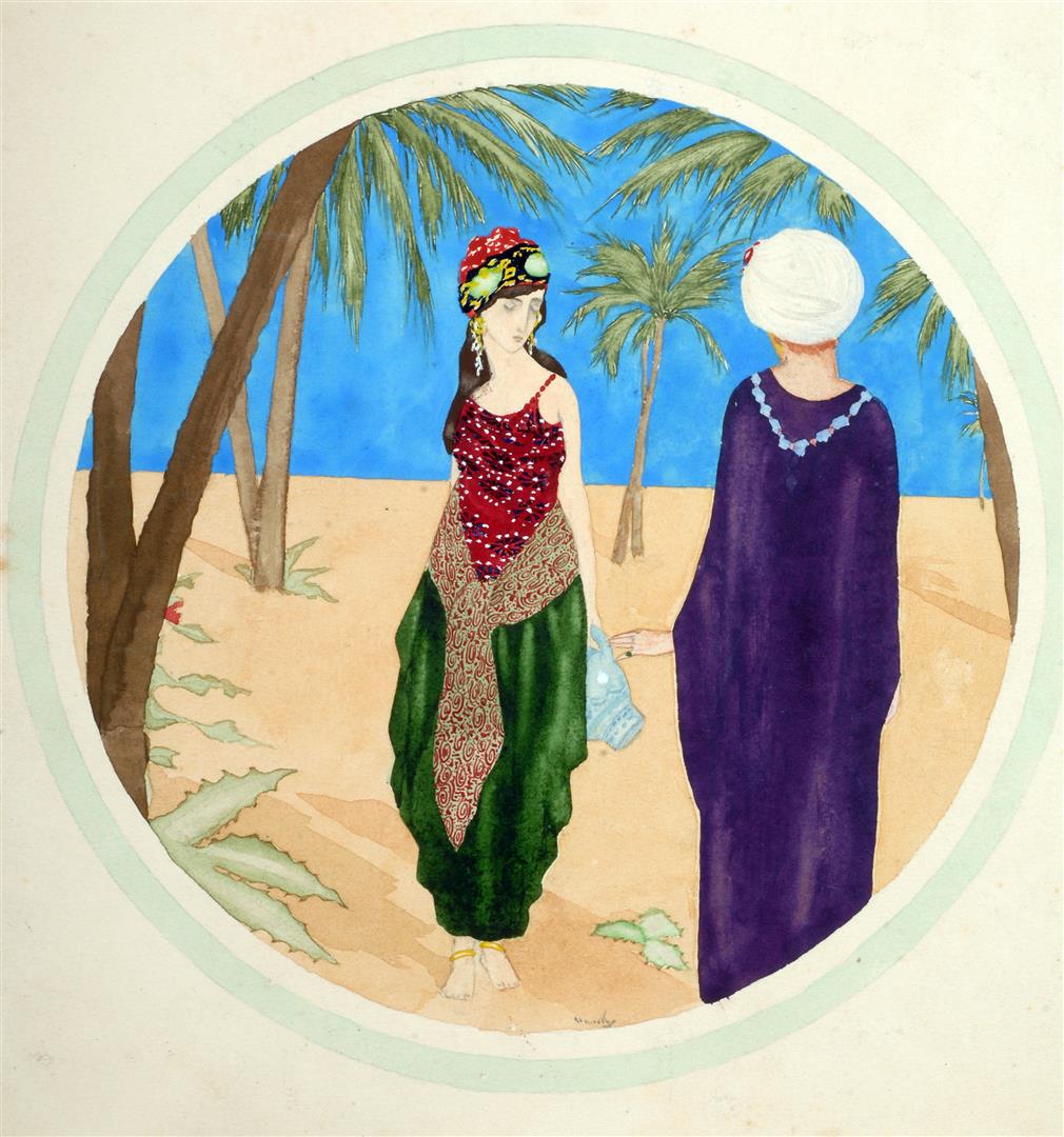 Ooster geklede man (op de rug gezien) en een vrouw (frontaal) in een woestijn.