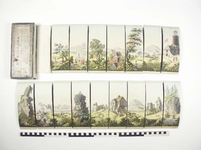 kartonnen doos, langwerpig-rechthoekig, blauw en wit beplakt; op het deksel een etiket met ornamentrandje: eikerank; opschrift 'Myriorama of Verzameling van duizenderlei landschappen geteekend door Mr. Clark te Amsterdam bij Gebroeders van Arum'; inhoud: 16 genummerde kaarten, die, aaneengelegd, een rivierlandschap vormen, gestoffeerd met huizen, ruïnes, bomeb en planten, figuren; hoe men de kaarten ook verlegt, ...