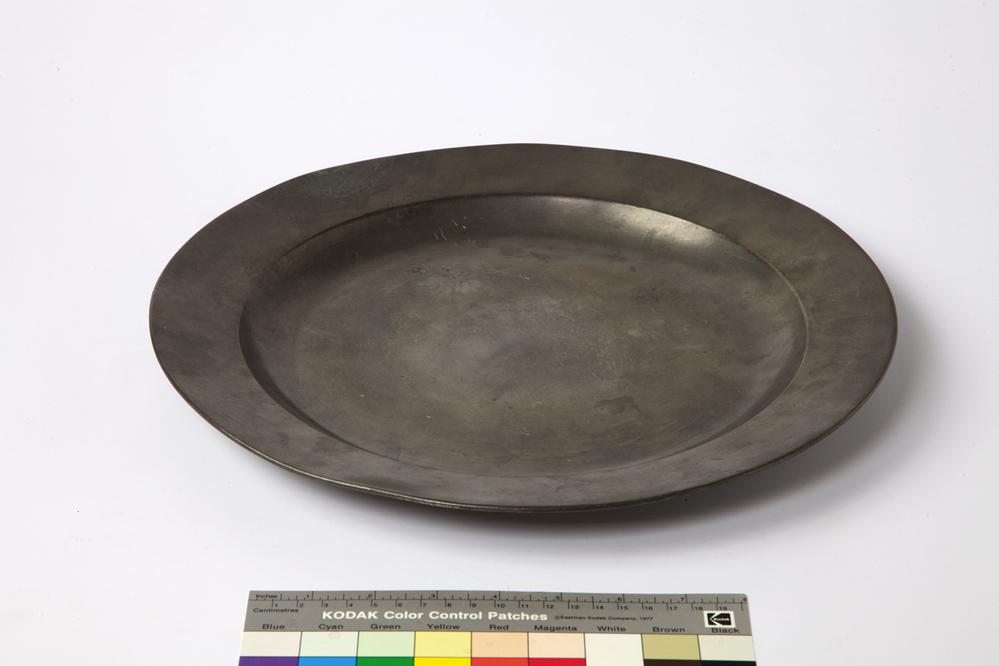 Een ronde schotel met ondiepe kom. De iets schuin omhoog staande boord heeft een versterkte rand met profiel aan de onderkant. De bodem is vlak. Aan de onderzijde zijn op de bodem de letters B.W.H. gegraveerd. Op de schotel staat een merk van Hendrik Kamphof (1833-1923), tinnegieter te Zwolle. In 1864 nam hij het tinnegietersbedrijf ...