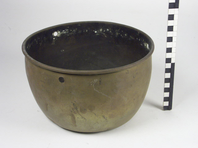 balans: ijzeren staaf met pen waaraan 2 schalen; de ene schepvormig met koperen haak; de andere rond aan 3 touwtjes, arm vrijwel rond in doorsnee, vroeg model eind zestiende eeuw, schalen vermoedelijk 19e eeuws