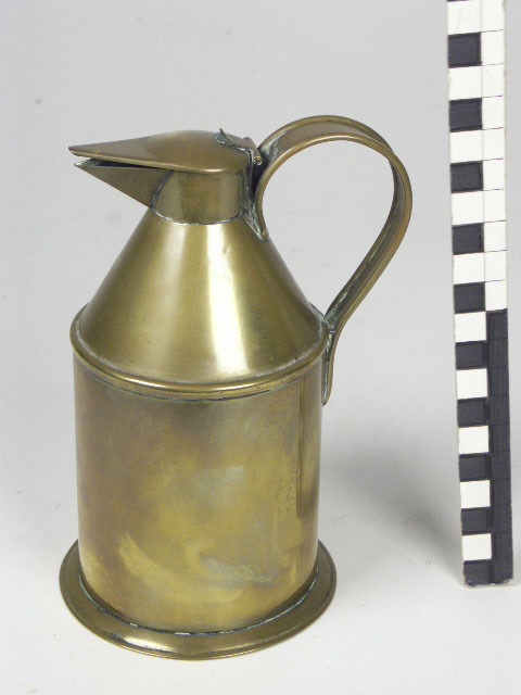 koperen kannetje; cylindrisch model met uitstekende bodem; van boven kegelvormig met deksel met 3 hoekige lip; gebogen hengsel
