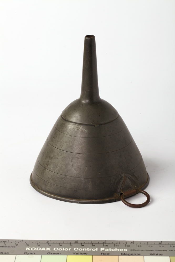 een conische trechter met slanke tuit; vlak onder de profiel rand is een haakje met ring aangesoldeerd zodat de trechter opgehangen kan worden; deze ring, van een ander metaal, is waarschijnlijk niet origineel, mede gezien de manier waarop hij is aangezet (beschadigingen op binnen- en buitenwand trechter); op de buitenwand zijn vier horizontaal lopende versieringslijnen ...