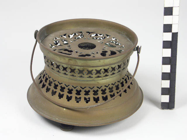 theeketel op lichtje; 1) keteltje met gewelfd dekseltje met houten knop en in- schietende ring; ellipsoïdische vorm met bol randje in het midden; gebogen tuit, die dun uitloopt; hoog gebogen hengsel met houten handvat in het midden; voet smaller, de buik gaat hierin welvend over; 2) het lichtje is rond, van boven cylindrisch; van onderen ...