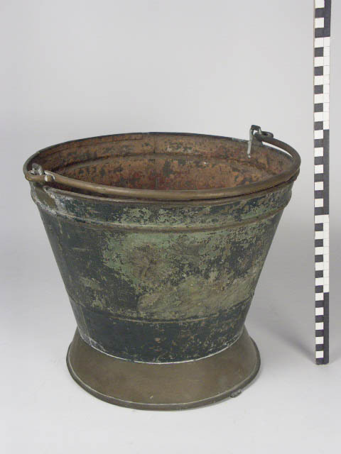 2 emmers; model omgekeerd conisch met brede conische stand- ring van koper en koperen hengsel; van binnen rood geverfd, van buiten groen.