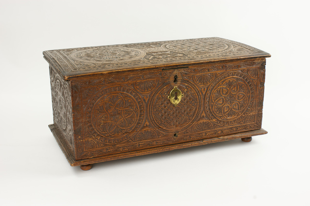 houten kistje van schrijnwerkersgilde (cassette); model: langwerpig kistje, rechthoekig met iets uitstekende bodem en deksel die even zacht is gebogen; bodem rust op 4 ronde pootjes; deksel openklapbaar d.m.v. scharnieren; aan de binnenkant met ijzerbeslag; decor: wanden en deksel geheel versierd met kerfwerk; cirkels met sterren erin en rankrandjes; aan voorkant 3, opzij 1 en ...