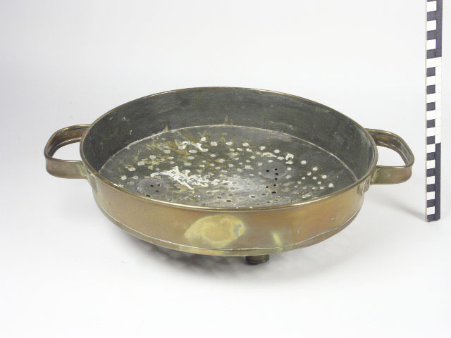 vergiet van koper met opstaande cylindrische rand; uitgebogen bodem met gaatjes; rustend op 3 cylindrische pootjes; aan de rand 2 liggende bandvormige oren