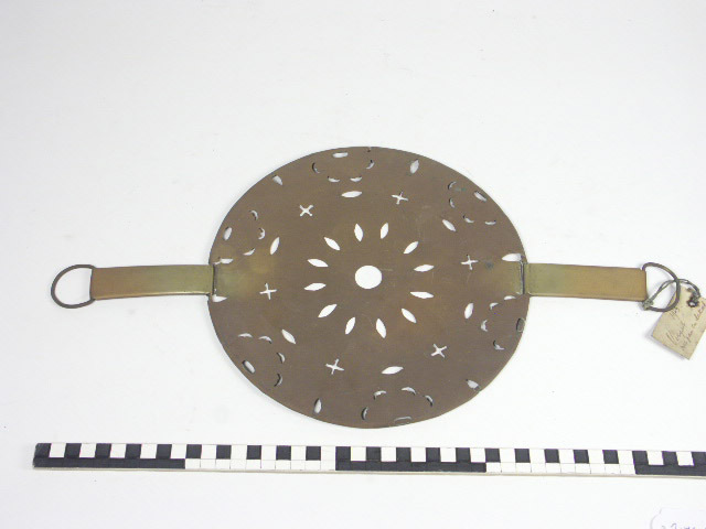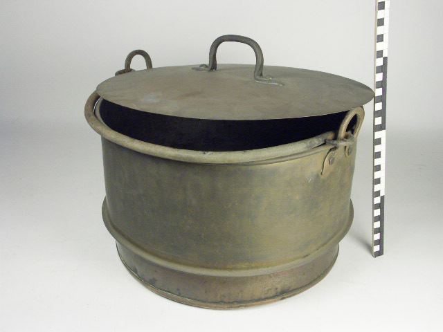 1) platte ronde pan met plat deksel met opstaande platte rand en staand gebogen oor; 2 oren, ombuigbaar. 2) platte ronde pan met glad deksel met staand roodkoperen oor. 3) rond cylindrische pan met roodkoperen benedengedeelte; hiertussen een uitstekende rand; ronde rand langs de monding; 2 staand oren aan de rand waaraan halfrond gebogen hengsel. ...