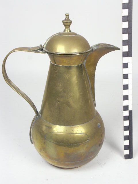2 schenkkannen; geelkoperen kannen; hoog model met scherp gebogen bandvormig oor; aangezet aan monding en buik; die bolvormig is; zonder voet; hierboven hoog conisch gedeelte met bovenop omgekeerd conische monding met bolvormig deksel met vaasvormige knop met scharnier; lange, sterk gebogen lip, uitlopend in scherpe hoek; afmeting 1) h29 diam. voet 8 diam. monding 8; ...