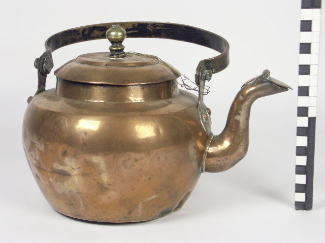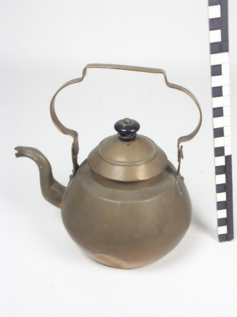 3 ketels; zakvormig model met gebogen tuit; cylindrische hals boven iets oplopende naar binnen ombuigende schouder; hierin past een overstekende trapsgewijs gewelfde deksel met balustervormige knop en inschietende ring; bij de schouder opstaande haakjes, waaraan gebogen hengsel; bij de grootste ketel klepje op de tuit; bij de 2e alleen aanziet hiervoor. 3) is zgn. 'koffiekonkeltjen'