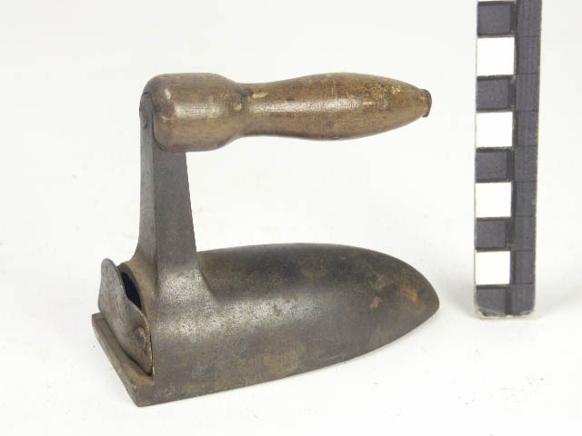 twee strijkijzertjes; 1) koperen houder met gladde wand op plat puntig uitlo- pende bodem; hierboven koperen bovenblad met roodkoperen tussenstukjes; bovenblad loopt ook puntig uit; hierboven 2 staafjes met liggend houten handvat, en haakje; 2) klein ijzeren strijkijzertje met houten handvat op verticale staaf en klepje; van binnen hol