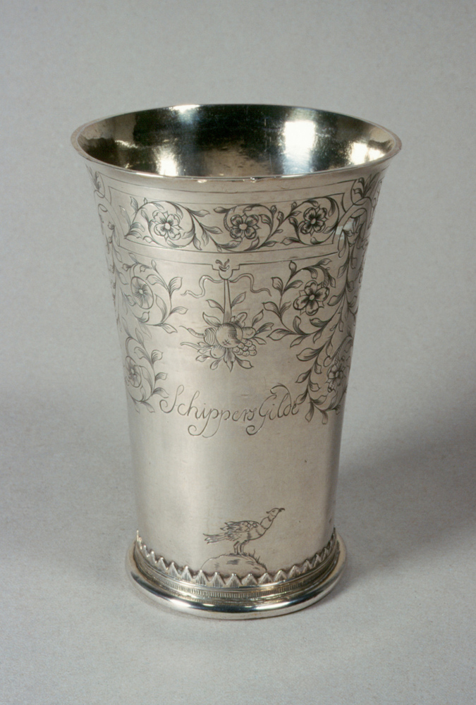 beker van het schippersgilde; hoge beker met iets uitwelvende rand op geprofileerde ronde voet met zigzag-rand; gegraveerd met rankmotieven en vruchten en onderaan 3 adelaars; opschrift: schippersgildekroes der Stadt Deventer 1686; op bodem ingegraveerd: Weegt 22 loot 3 Engels Gemerkt: Utrecht meesterteken: S met hamer= Johan Smout jaarletter: T=1683