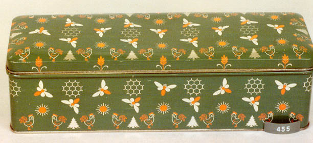 vorm:Rechthoekig;scharnierend deksel,oversluitend. rolranden;steunvoor. vervaardiging:gefelste langsnaad;omhangscharnier met losse lipjes. Decoratie:Groene ondergrond met verspreide tekeningen in wit,zilver en oranje van bijen, raten,zon,hanen. (op bodem)2 gekruiste vlaggen Tekst:(relief bodem) De Spar 1932-1957