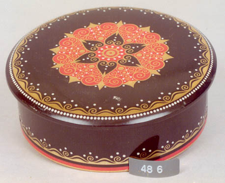 vorm:Rond;insdrukdeksel,met overkragende rand. Drie pootjes. vervaardiging:Gefelste langsnaad;pootjes uitgedrukt. Decoratie:Zwarte ondergrond.Versiering in relief in rood en goud.In midden gestileerd bloemmotief met randjes en krullen.