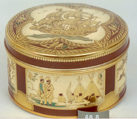 vorm:Rond;oversluitdeksel;steunvoor,rolranden. vervaardiging:gefelste langsnaad. Decoratie:Creme ondergrond met randen en voorstellingen in relief in donkerbruin en goud. Voorstelling op deksel: Zeilschip;op zijde:Indianen bij tent,indiaan schiet vogel.