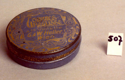 vorm:Rond met los oversluitdeksel. vervaardiging:Doos en deksel uit een stuk.Steunvoor halverwege zijde. decoratie:Grijsblauwe ondergrond met gouden opdruk. Sierrand met ranken op deksel en tekst. tekst:GOMMES REGLISES a la violette G & W. Heller, Wien.