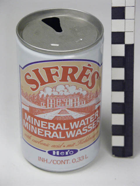 Vorm:2-delig;genekt;holle bodem;trekring bovenop verdwenen (5 2A 3) Vervaardiging:gefelste deksel; Decoratie:Witte ondergrond twee maal een blauw omrand `etiket' met voorstelling van landhuis in rood/wit. Blauw HERO logo,weggooi picto en BAR code Tekst:SIFRES bronwater koolzuurhoudend (ook in Frans,Duits, Engels) Inh./cont.0,33 l Hero Breda Holland Hr Brus 254066 RC Brux.