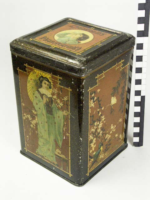 Vorm:Vierkant,hoog;scharnierend oversluitdeksel;steunvoor; Vervaardiging:gefelste langsnaad en bodem;naaldscharnier Decoratie:Achtergrond:bruin/goud gemeleerd;op elke zijde, met bamboe omlijste oosterse voorstelling, twee met vrouw en twee met vogeltje.Bovenop rond medaillon met chocoladrinkend meisje. Tekst:CHOCOLAT MARTOUGIN