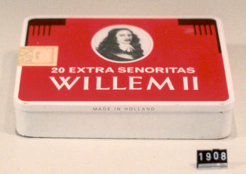Vorm:rechthoekig;scharnierend oversluitdeksel; vouwrand deksel. Vervaardiging:geen naden;omhangscharnier decoratie:witte doos met rood deksel met ovaal medaillon, waarin mannenkop met lang haar;binnenzijde deksel:tekst en fabrieksmerk tekst:Willem II 20 extra senoritas ;20 cigars made in Holland; bv Willem II, Valkenswaard